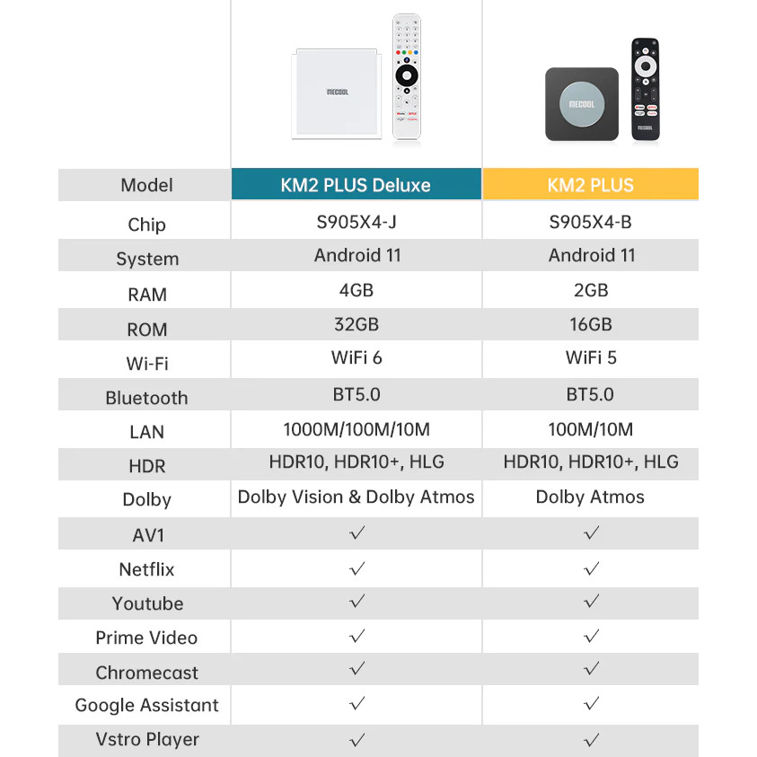 Lựa chọn: 1. Nguyên ZIN = Sản phẩm sẽ được để nguyên hộp từ nhà SX, bên bán hàng chỉ dán tem bảo hành Khách hàng nhận được sẽ tự đăng nhập và bung ứng dụng cơ bản do Mecool cung cấp 2 Cài đặt ứng dụng = Tuệ Minh sẽ bung ứng dụng và đăng nhập tạm tài khoản sau đó thực hiện cài các ứng dụng như Kho ứng dụng bên thứ 3 để cài app di động, các ứng dụng xem truyền hình như FPT Play, VTVgo và một số app xem truyền hình miễn phí. , Android TV Box Mecool KM2 Plus Deluxe là phiên bản nâng cấp của Mecool KM2 Plus. Trên bản mới KM2 Plus Deluxe người dùng sẽ được trang bị thêm phần cấu hình rất mạnh nếu so sánh với model thế hệ cũ , Đầu tiên, KM2 Plus Delux sẽ thừa hường toàn bộ những tính năng tương tự như Mecool KM2 Plus như AndroidTV chính chủ, Chromecast, Netflix 4K cấp phép, Dolby Audio.... Netflix 4K là điểm nhấn rất lớn ở KM2, KM2 Plus và trên phiên bản KM2 Plus Deluxe này chúng ta cũng sẽ có bản Netflix 4K được cấp phép. Với phiên bản cấp phép, người dùng sẽ trải nghiệm Netflix ở chất lượng hình ảnh và âm thanh cao nhất. Các trường hợp cài bản Netflix không được cấp phép sẽ thiếu ổn định và thường xuyên bị khóa khi Netflix tiến hành kiểm tra. Ngoài Netflix 4K được cấp phép trên Mecool KM2 Plus Deluxe, người dùng cũng có thể trải nghiệm thêm ứng dụng PrimeVideo với rất nhiều phim hay tương tự như Netflix , KM2 Plus Deluxe hỗ trợ âm thanh Dolby Audio giúp người dùng có trải nghiệm âm thanh đỉnh cao Chromecast là ứng dụng phản chiếu hình ảnh có độ ổn định cao nhất hiện nay và chỉ được tính hợp trên các dòng AndroidTV chính chủ google cấp phép. Với những Android TV Box phổ thông, người dùng sẽ phải sử dụng phần mềm bên thứ 3, nhưng chưa có phần mềm nào đạt được sự ổn định và ít delay như Chromecast Tính năng này rất phù hợp cho người sử dụng có nhu cầu phản chiếu Youtube để hát Karaoke, xem phim... , Mecool KM2 Plus Deluxe hỗ trợ công nghệ hiển thị hình ảnh 4K HDR cho trải nghiệm sống động và mầu sắc mượt mà Điểm khác biệt giữa KM2 Plus và KM2 Plus Deluxe nằm ở thông số phần cứng được nâng cấp như Ram 4GB, Bộ nhớ trong 32GB, Wifi 6, LAN 1000 ,