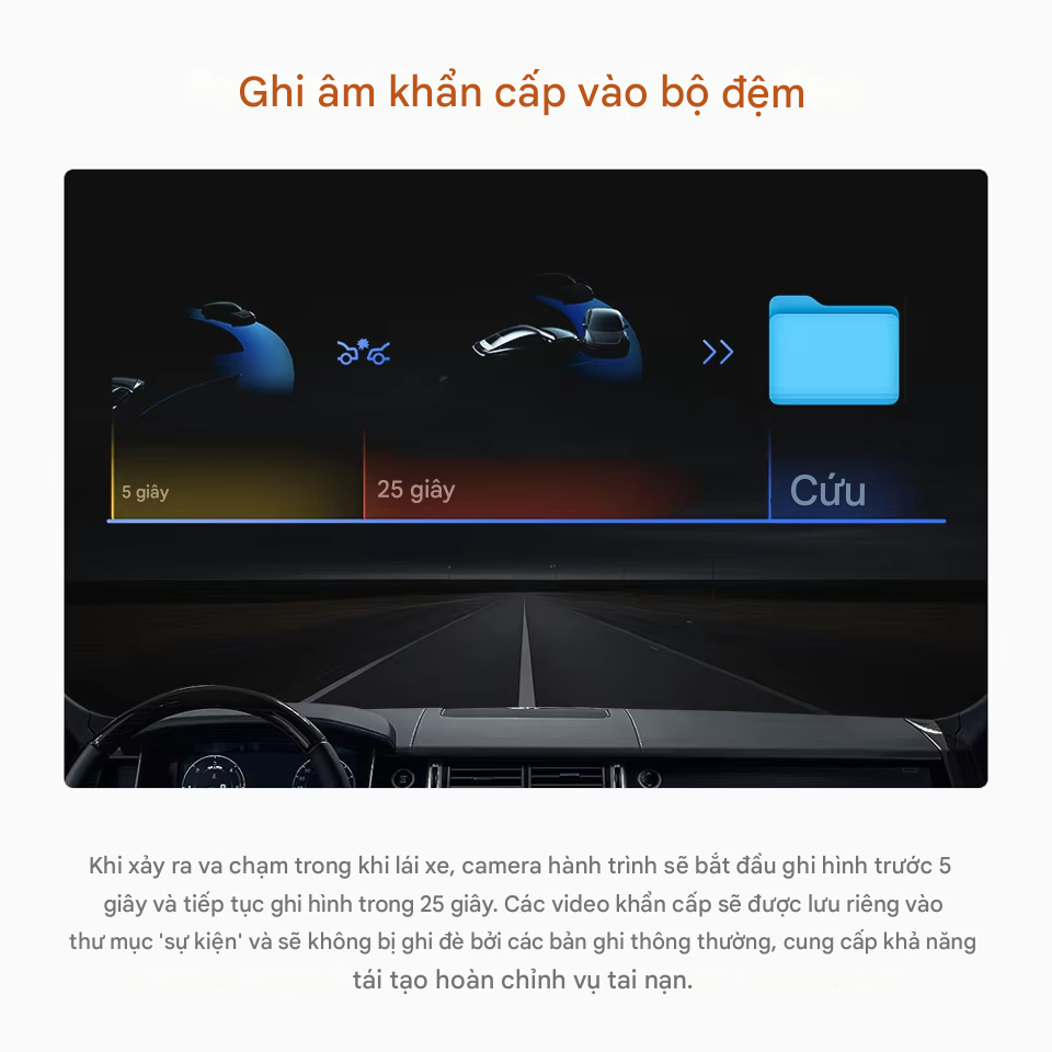 ADAS HỖ TRỢ LÁI XE AN TOÀN Tính năng ADAS sẽ có 3 chức năng chính 1. Cảnh báo nguy cơ đi lệch làn đường 2. Cảnh báo nguy cơ va chạm với xe phía trước 3. Cảnh báo xe phía trước di chuyển HỖ TRỢ ĐỖ XE AN TOÀN Nếu khách hàng mua thêm bộ Hardwire Kit và thực hiện lắp đặt thì khi đó sẽ kích hoạt được tính năng Hỗ trợ đỗ xe an toàn. Chi tiết về tính năng này, bạn có thể xem tại link: * Bộ Hardwire Kit là phụ kiện mua rời, không có sẵn trong hộp sản phẩm. Đây là phụ kiện mua thêm GIÁM SÁT ĐỖ XE TỪ XA Khi lắp đặt bộ Kit 4G kèm Sim, khách hàng có thể kích hoạt được tính năng giám sát đỗ xe từ xa. Nếu khi xe đang đỗ, xe bị va chạm thì Camera sẽ lập tức khởi động ghi hình và đồng thời gửi thông báo về điện thoại Khách hàng có thể truy cập trực tiếp vào camera khi nhận được thông báo. Tuy nhiên chỉ có thể truy cập vào trong trường hợp xe đang dừng đỗ và không bật nguồn điện. Nếu xe đang di chuyển thì sẽ không thể truy cập từ xa vào Camera Để kích hoạt được tính năng Giám sát đỗ xe an toàn, khách hàng cần mua thêm Bộ Kit 4G. (Bộ sản phẩm này không có sẵn trong hộp đóng gói sản phẩm, đây là phụ kiện mua thêm)