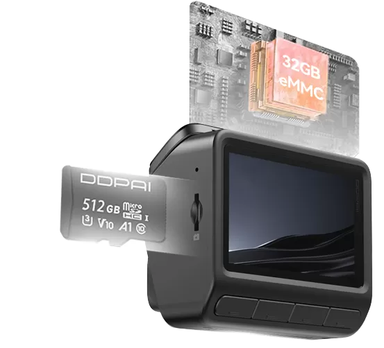 Với công nghệ D²save 2.0 của DDPAI, Z60 tích hợp bộ nhớ trong eMMC 32GB và hỗ trợ mở rộng thẻ nhớ microSD lên đến 512GB. Nếu thẻ nhớ microSD bị lỗi, chế độ ghi hình sẽ tự động chuyển sang bộ nhớ trong, bảo vệ dữ liệu quan trọng.